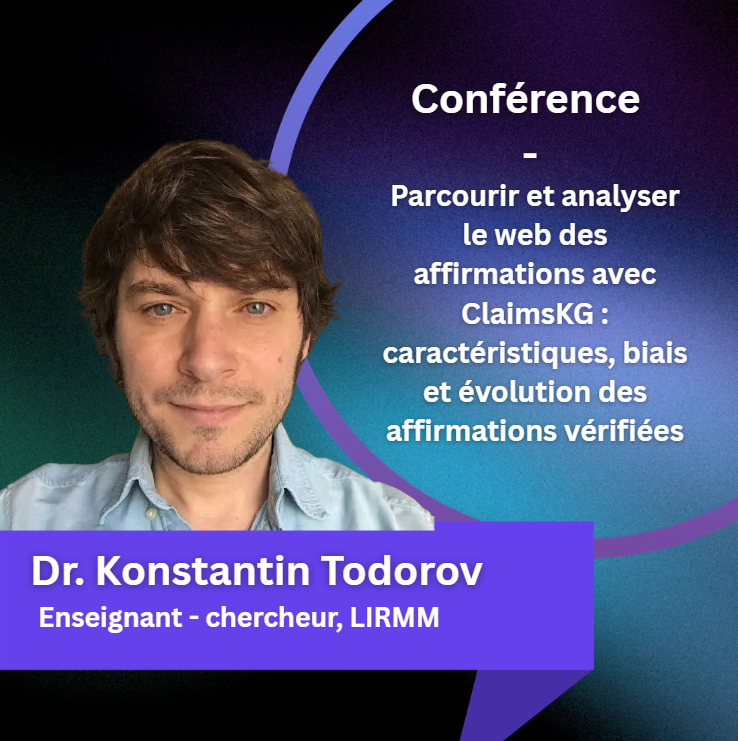 Construit à partir de plusieurs portails spécialisés, ClaimsKG permet d’analyser les débats sociétaux en ligne et de faciliter la vérification des faits grâce à des outils dédiés. L’exposé abordera également les caractéristiques, les biais et l’évolution des affirmations vérifiées sur le Web.
